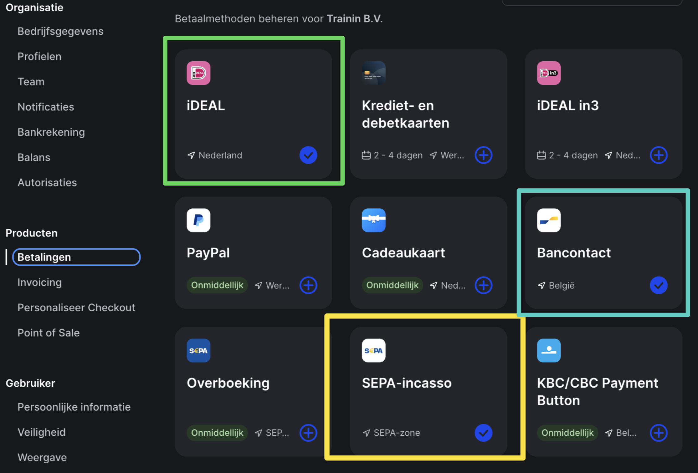 Cuando Mollie haya aprobado los métodos de pago (nuevos o existentes), aparecerán aquí con un check verde.