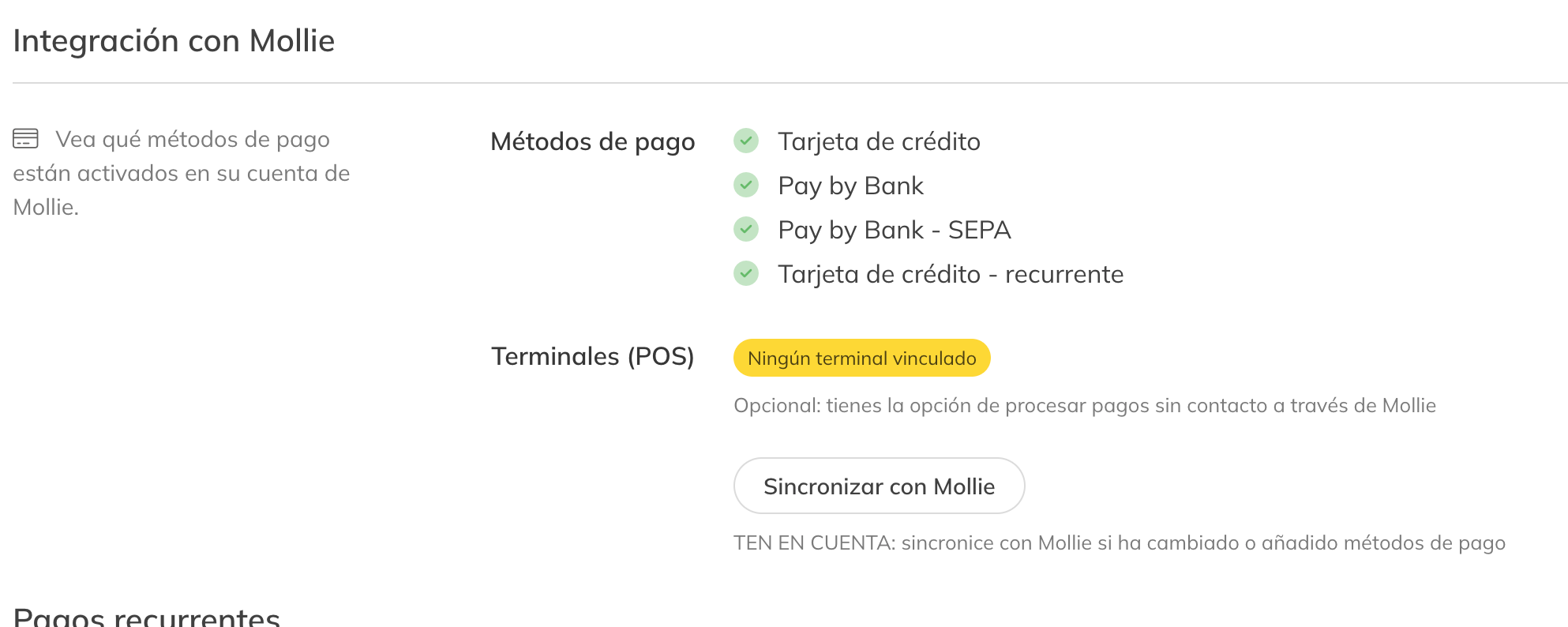 Si ya habías conectado Mollie anteriormente, puedes hacer clic en el botón “Sincronizar con Mollie”.