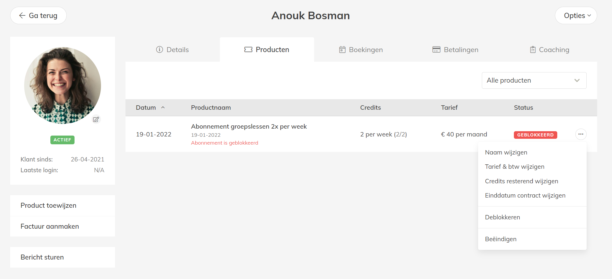 Verder kan een abonnement automatisch worden geblokkeerd omdat er een terugstorting (chargeback) heeft plaatsgevonden (hier zal je een melding van krijgen). De klant heeft dan actief de betaling teruggestort. Wanneer het abonnement is geblokkeerd dan kan de klant tijdelijk het abonnement niet gebruiken om boekingen te doen totdat jij het abonnement weer deblokkeert.